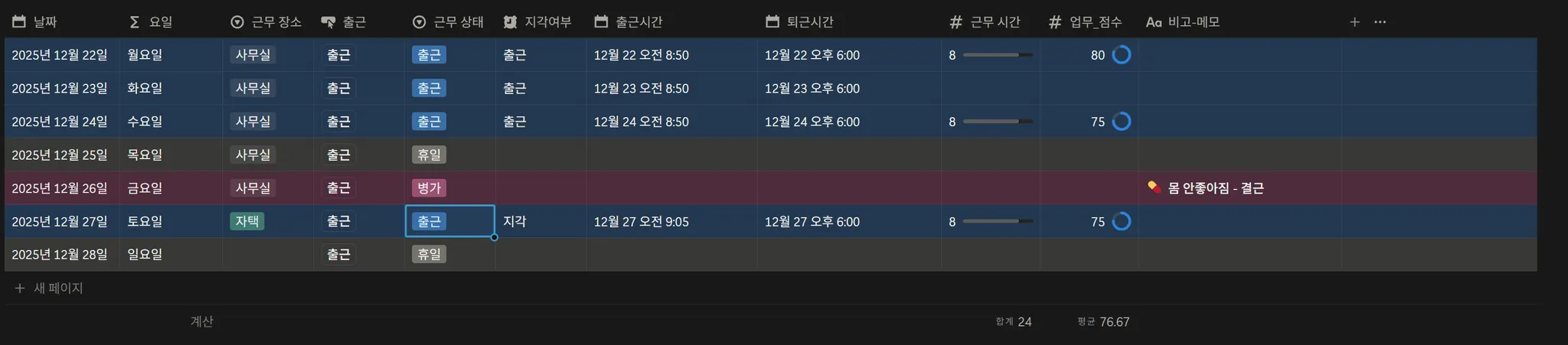 프리랜서의 실제 근무 흐름에 맞춰 설계된, 출퇴근·근무시간을 한눈에 정리하는 노션 템플릿입니다.